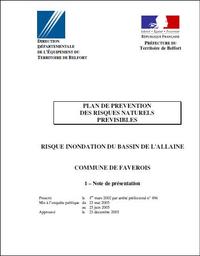 Le Plan de Prévention des Risques Naturels d'Inondation du bassin de l'Allaine à Faverois comprend une notice explicative, un règlement et une carte de zonage. Il fournit des informations sur les Risques d'Inondation par débordement de la Coeuvatte. Il réglemente les aménagements et les constructions.