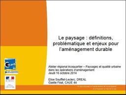 Ce document co- réalisé par Elise SOUFFLET de la DREAL des Pays de la Loire et Gaëlle FEAT du CAUE Loire-Atlantique, sous la forme d'un PowerPoint a, été présenté lors de l' Atelier régional ÉcoQuartiers "Paysages et Qualité Urbaine dans les opérations d’aménagement" organisé le 16 octobre 2014. par la DREAL des Pays de la Loire.